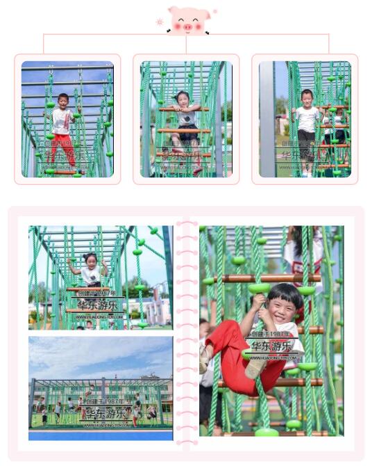 人猿泰山式藤条攀爬,蜘蛛侠式的来回穿梭于整个丛林是每个孩子童年的梦想,由于考虑孩子的自身体力,小朋友的安全保护意识,我们在爬绳上增加了圆盘,让小朋友在攀爬的过程中可以有很好的抓力以及在攀爬过程中可以得到适当的休息。