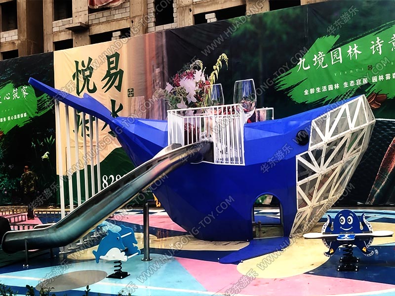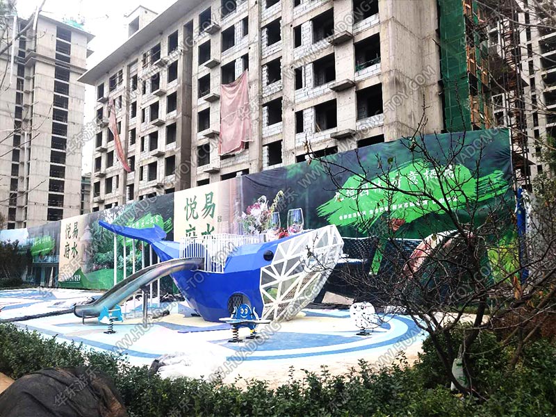 易水悦府房地产项目是一个综合性的休闲、娱乐、生活为一体的生活服务器区,在这里主要为小区业主提供一个可以互动、交流、玩耍的场所,该项目采用了金沙游乐自主设计的大鲸鱼滑梯为主,附加摇摇马等游乐设施,整个项目设计完美,实用性强,深受业主们的喜爱。