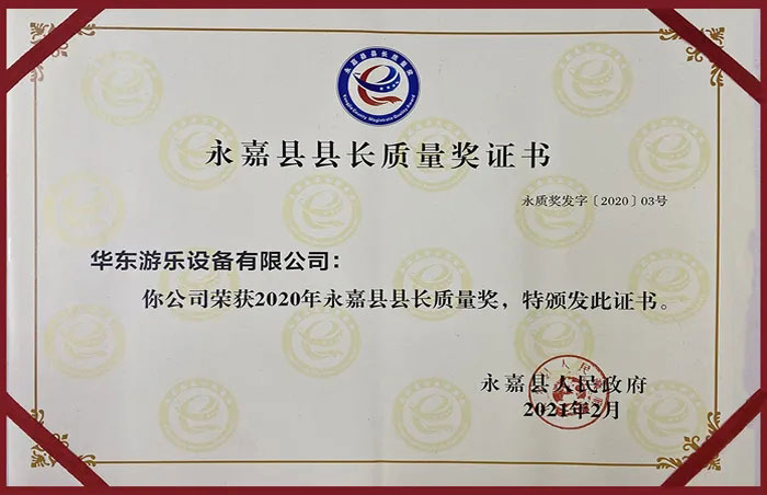 2020年,对广大企业来说注定是困难的一年,作为游乐设备行业的先锋企业,金沙游乐紧紧围绕永嘉县总体经济发展为目标任务,主动适应经济发展新常态,积极应对2020年疫情期间的“复工复产”等工作,取得了显著成绩,被永嘉县人民政府评为“2020年度巨龙企业”和“县长质量奖”的荣誉。