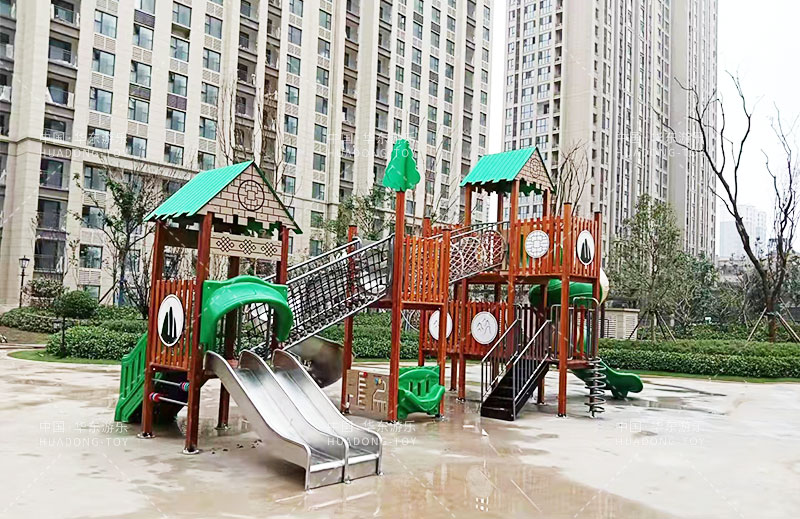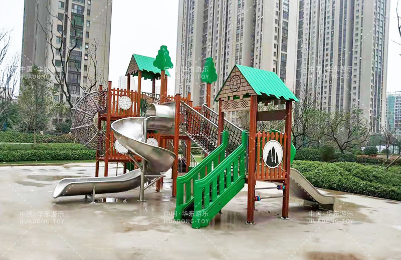 荣盛华府选用的是金沙游乐自主设计的具有攀爬网、U型爬网、不锈钢滑梯、网桥、滑桶为一体的综合性游乐设备。