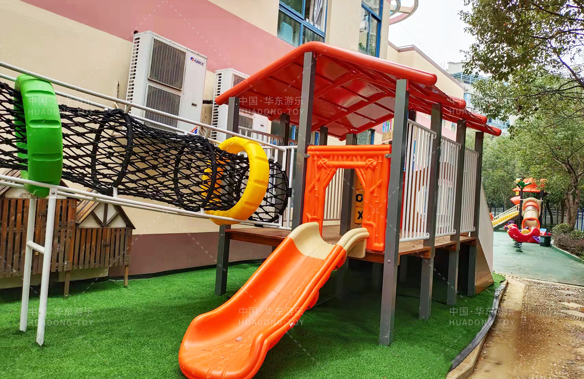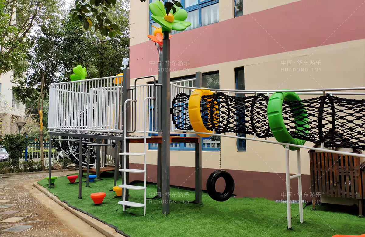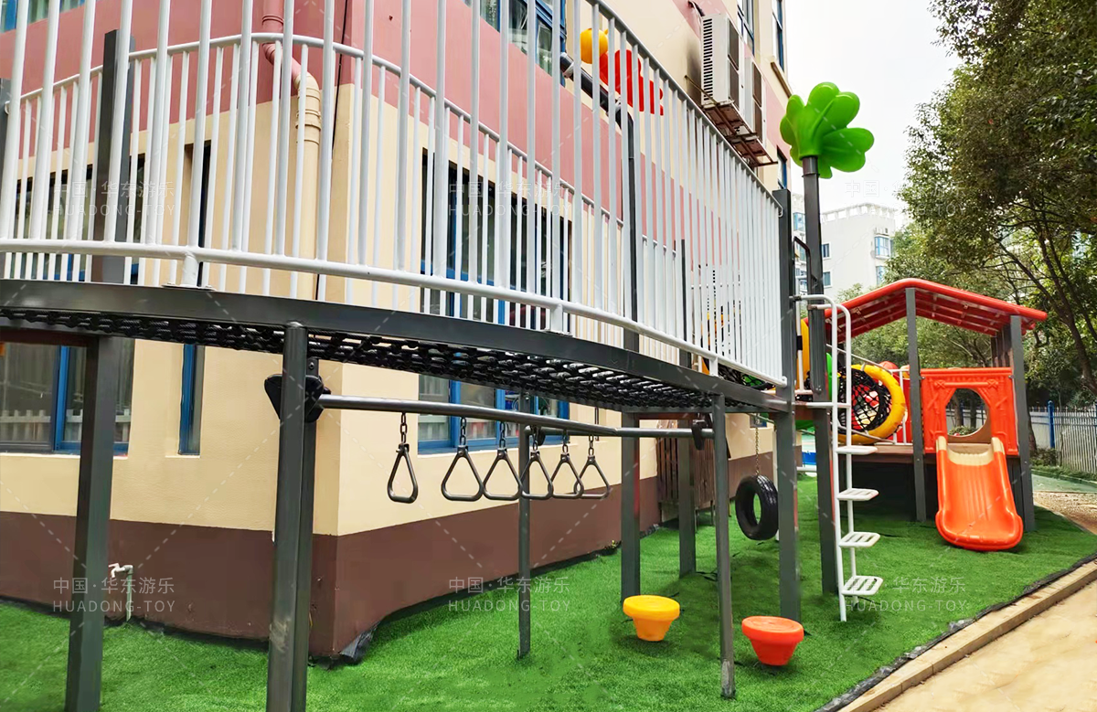 绿都幼儿园选用的是金沙游乐自主研发的具有攀爬、滑梯、爬网、钻洞、葫芦攀爬为一体的综合性游乐设备。