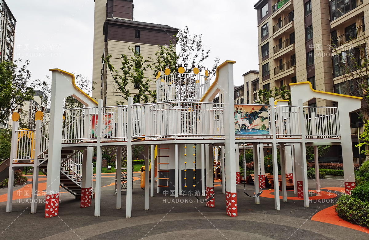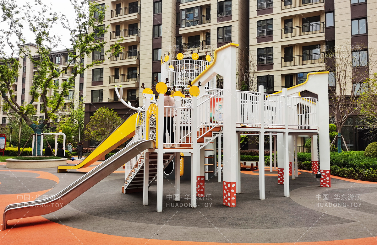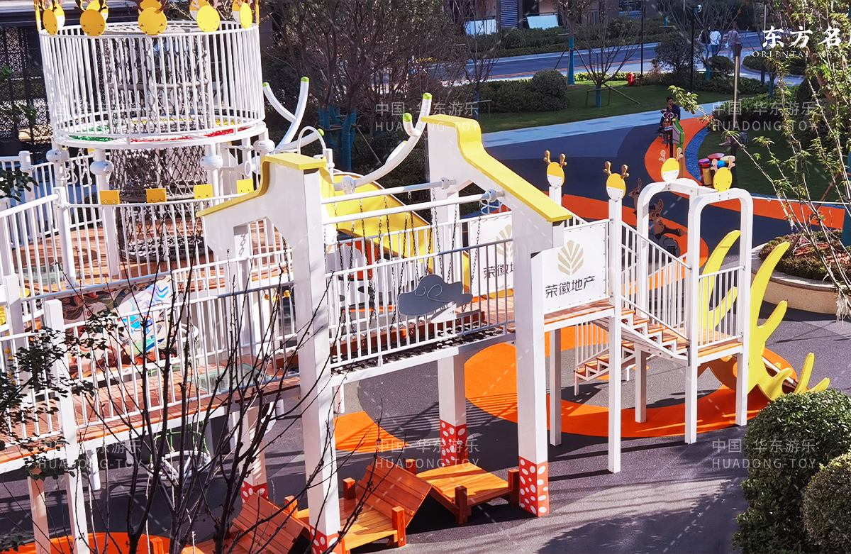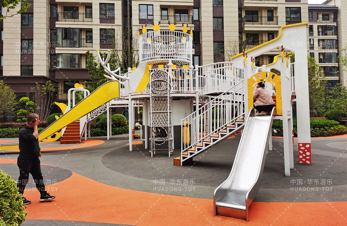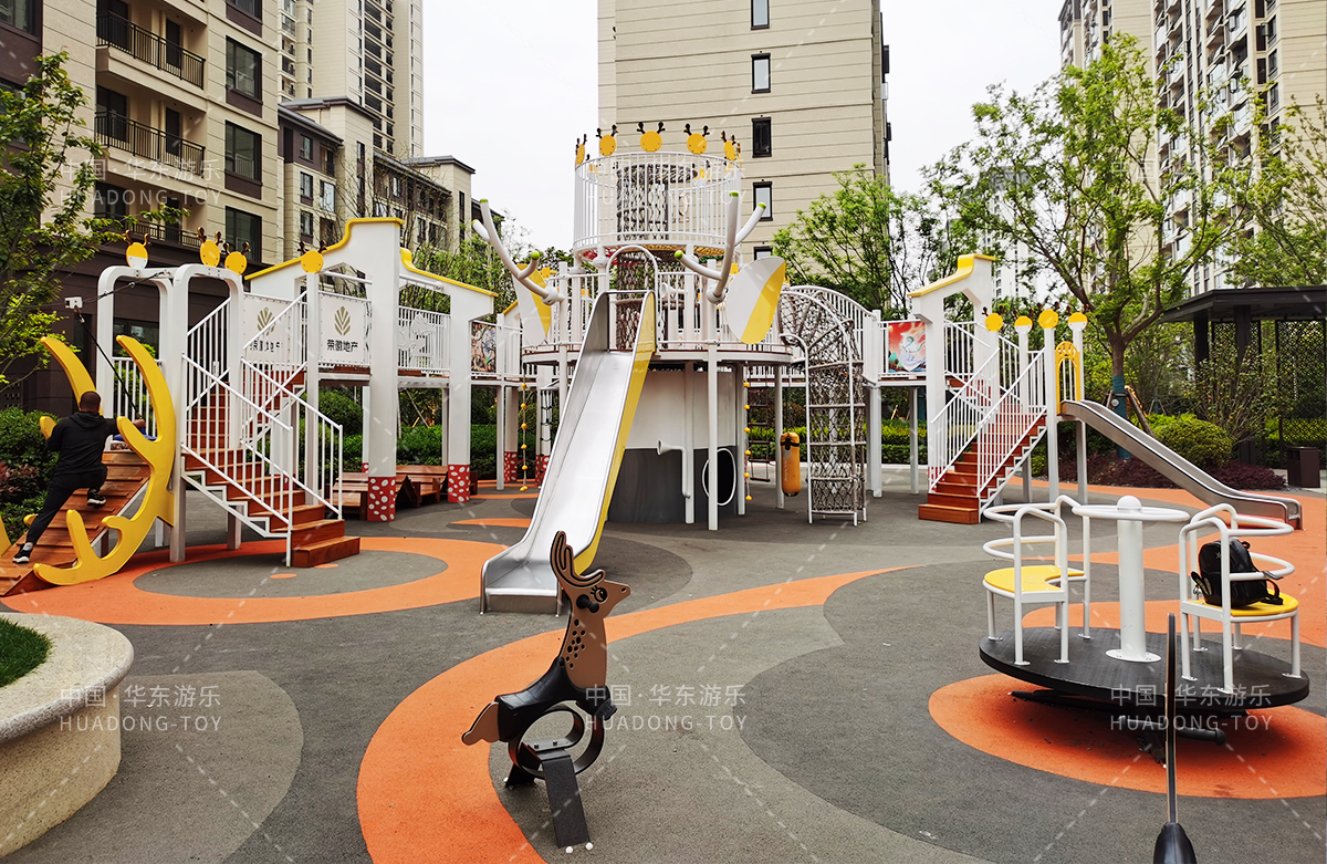 东方名府云著此次选用的是金沙游乐自主研发和生产的无动力游乐设备,采用的是以麋鹿为主题的综合性游乐园,整个游乐园分别设计了小朋友喜欢的儿童跷跷板、打击乐器、儿童摇摇乐,以及和具备不锈钢滑梯、攀爬网、攀爬绳、攀爬梯等功能的麋鹿组合滑梯等游乐设备。