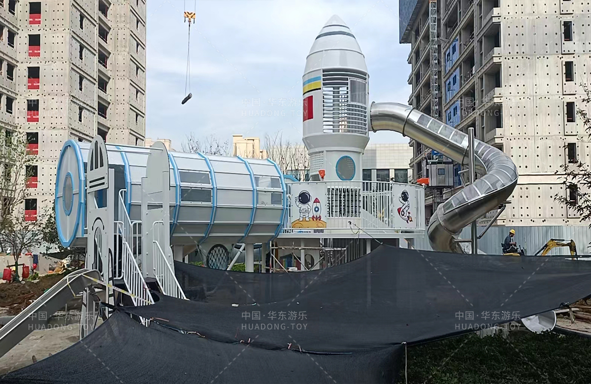 安徽省亳州市涡阳县荣徽上河郡选用的是金沙游乐自主研发和生产的以航天飞机为主题的大型非标定制的游乐设备,是一款具备了攀爬网、攀爬梯、旋转滑筒、儿童摇摇乐为一体的综合性儿童游乐场。