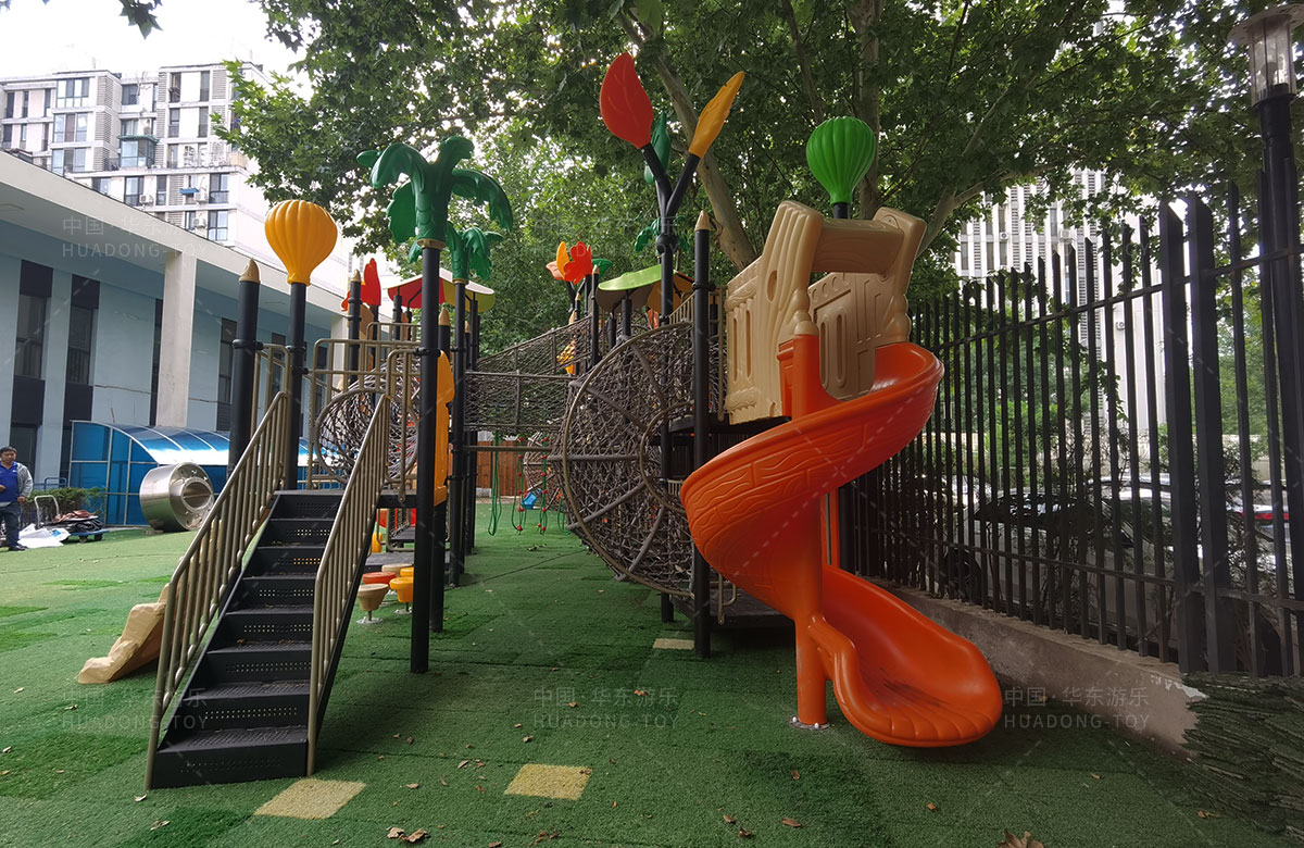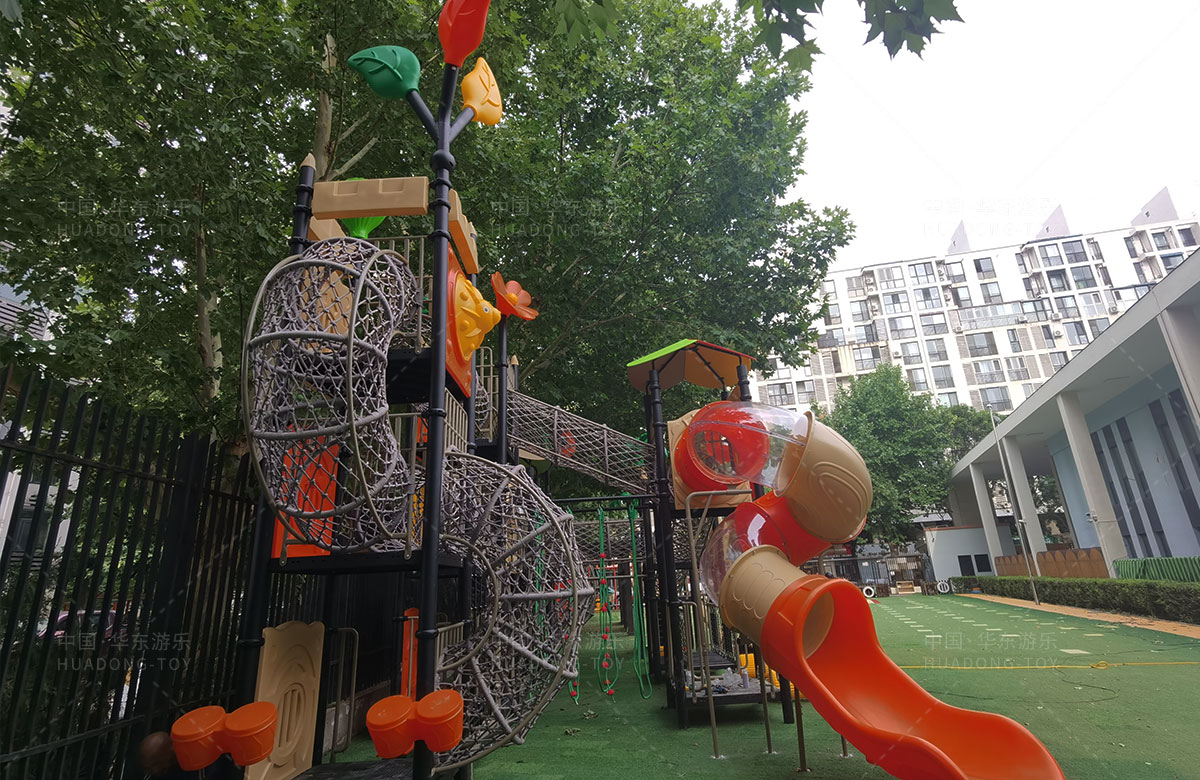 北京市朝阳区管庄忠德幼儿园选用的是金沙游乐自主研发和设计的大自然系列组合滑梯,该滑梯是一款具备了攀爬网、钻洞、滑梯、丛林拓展、拍拍鼓、攀爬墙、固定踏踏车、平衡桩等功能为一体的综合性 游乐设备,能够很好的锻炼小朋友的全面发展。