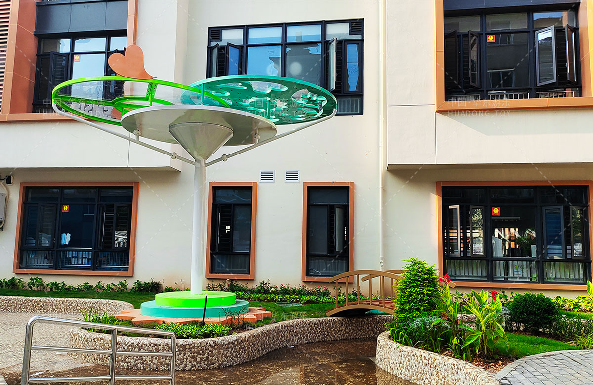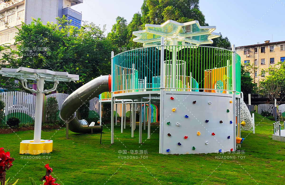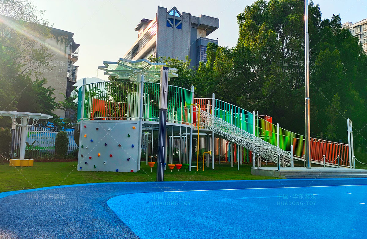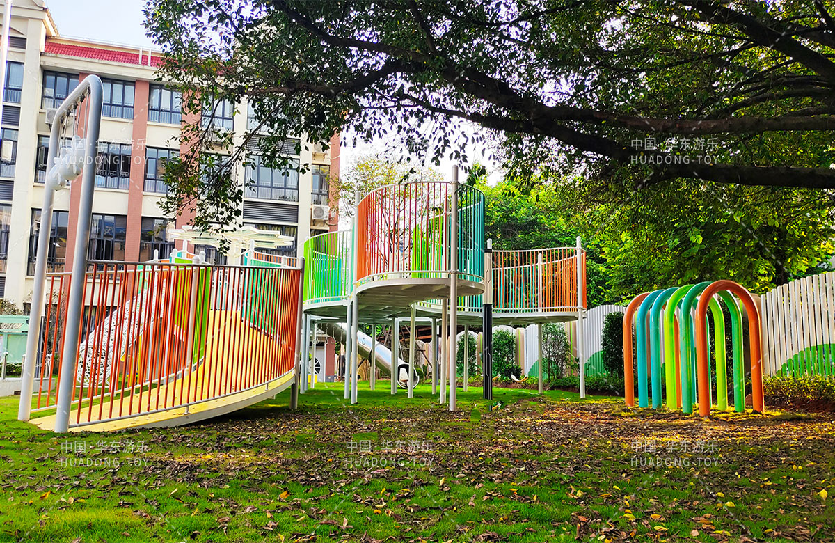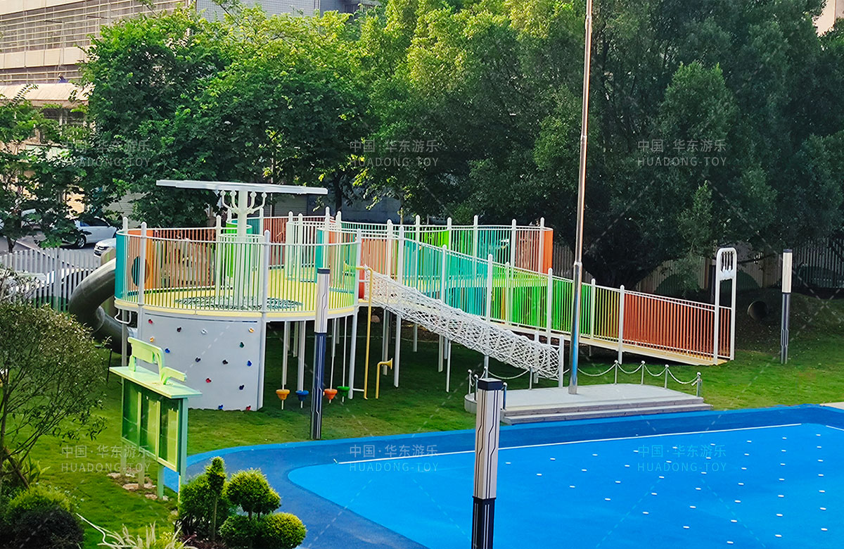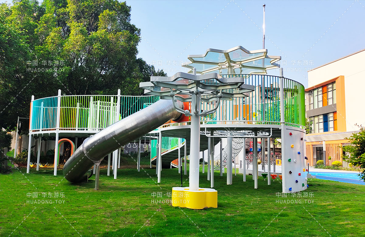 三明市实验幼儿园 选用的是金沙游乐自主研发和设计的非标定制系列的组合游乐设备,是一款具备了攀爬网、空中网桥、攀爬墙、儿童秋千、大型滑筒、平衡吊环、彩虹桥等功能,除此之外还设置了树形休闲厅、木制小桥等游乐设备,让孩子们有一个健康的成长环境,也为老师的教学提供了保障。