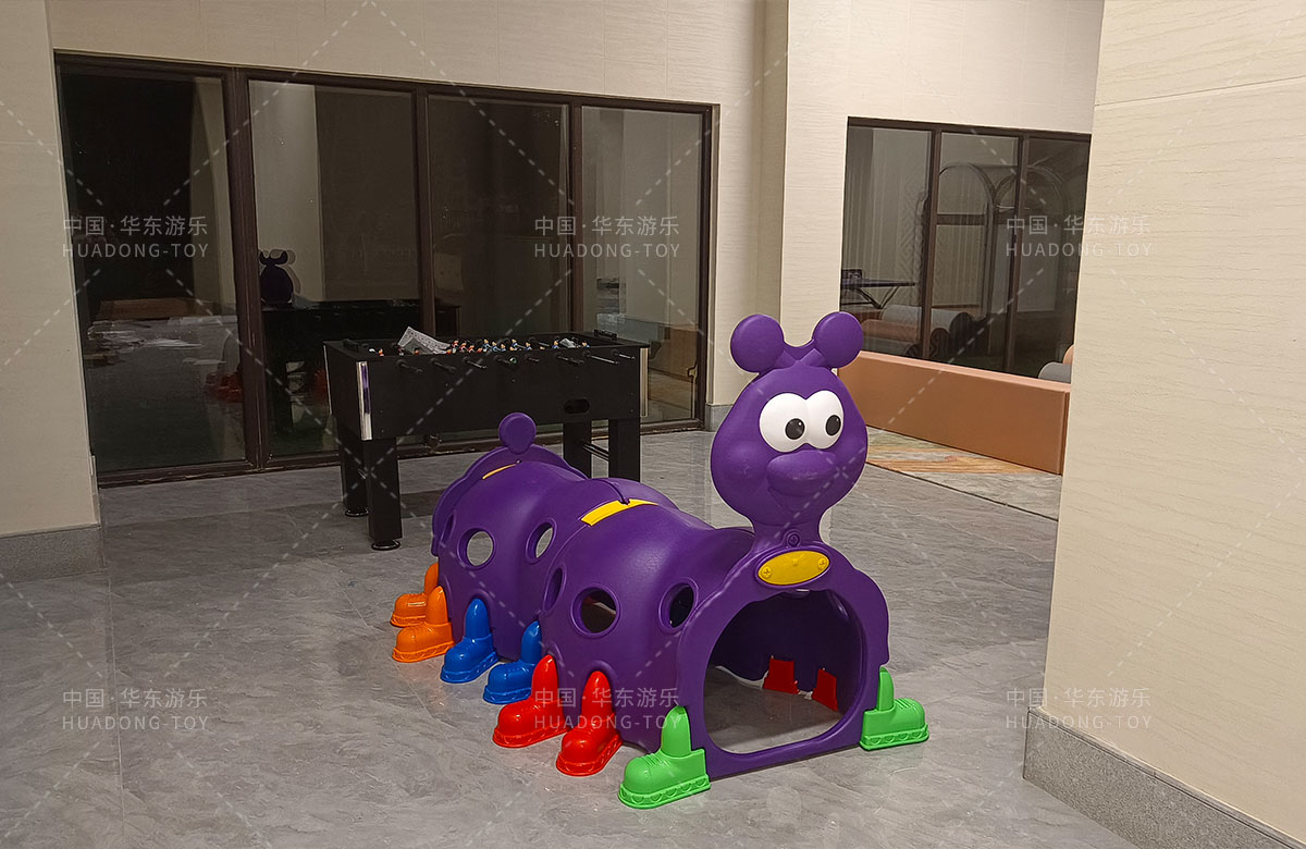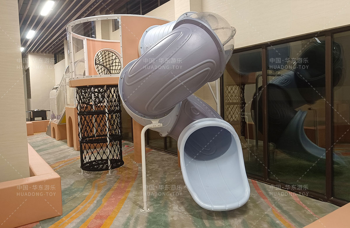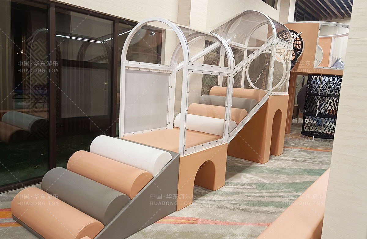 该项目选用的是金沙游乐生产的室内淘气堡系列产品,整套设备集合了攀爬网、钻洞、攀爬梯、旋转滑筒等功能,除此之外还设置了小朋友们喜欢的毛毛虫钻洞,儿童台球、乒乓球、桌面足球等设备,让整个售楼处变得更加的充满生机与活力。