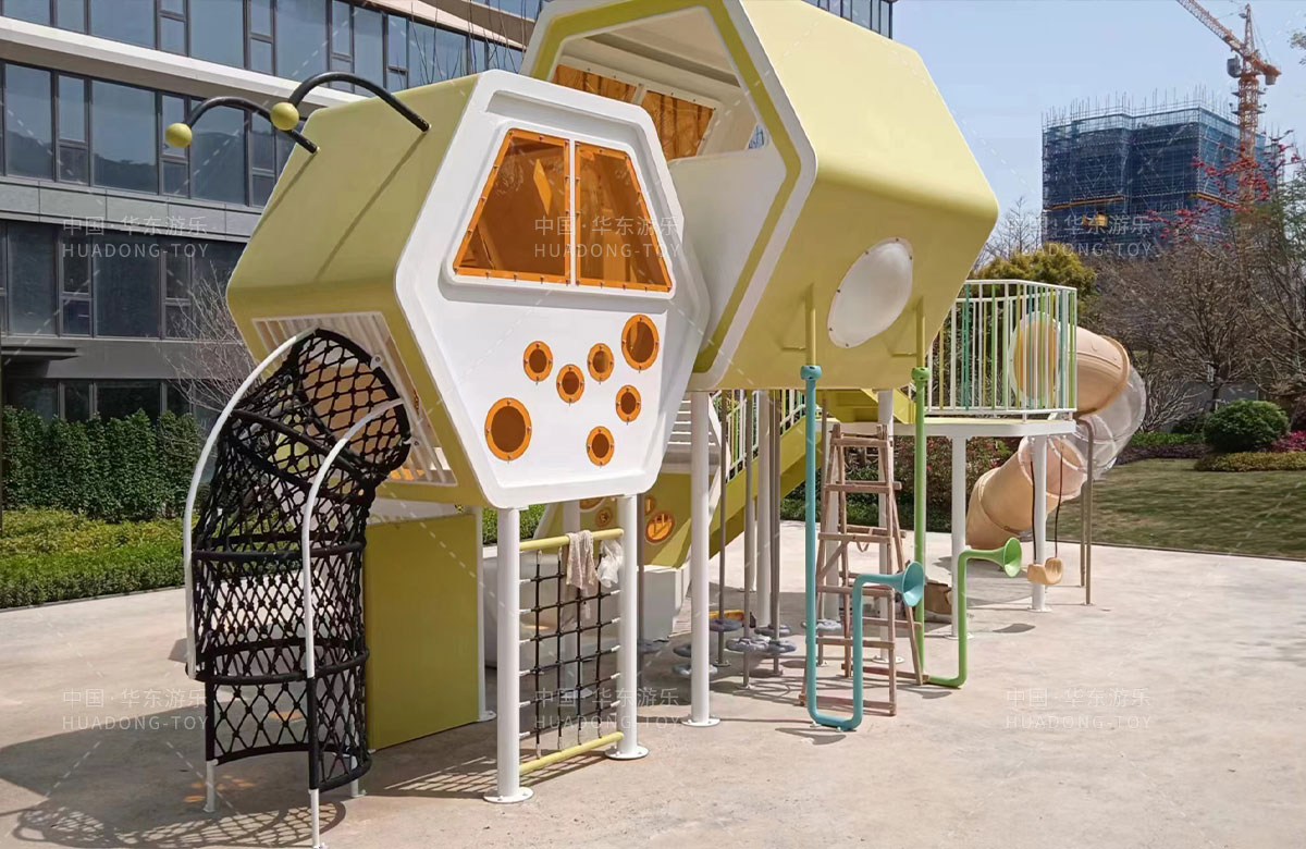 该项目选用的是金沙游乐自主研发和设计的以蜜蜂巢穴为主题的游乐园,具备了大型滑梯、攀爬网、传声筒、儿童秋千、平衡杆等功能,同时为了更好的关注老年人的晚年健康,该项目还设计了不同功能的成人健身器,让更多的人群有一个休闲、娱乐、健身的场所。