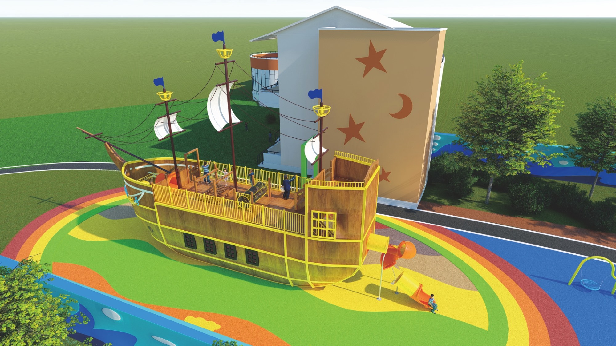 木质海盗船组合滑梯的设计以大自然为主题,融合了船体、桅杆、甲板等元素,外观新颖、结构牢固。它集攀爬、滑梯、秋千等功能于一体,旨在锻炼孩子的平衡协调能力和自我保护意识,同时培养探险精神。