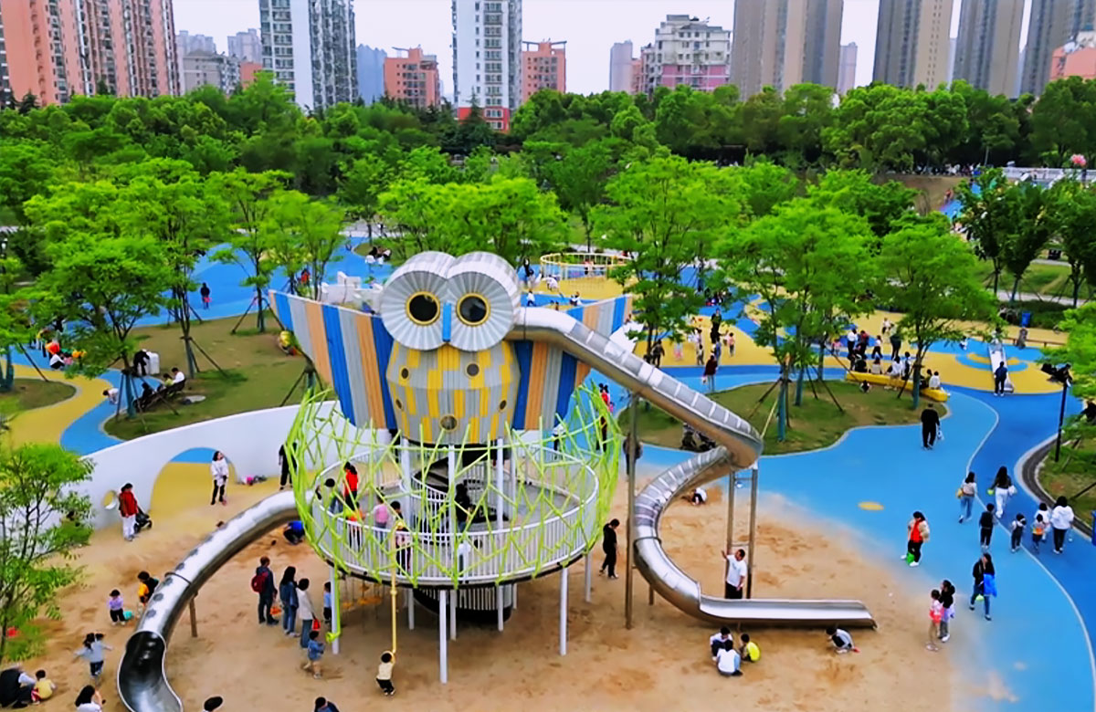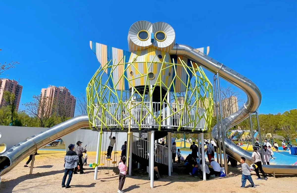 张毕湖公园定位为生态水体公园,是一个兼具湿地科普和放松休闲功能的城市综合公园。 该项目选用的是金沙游乐自主研发和设计的综合性游乐设备,分别设置了猫头鹰主题的组合滑梯,各种类型的组合秋千、不锈钢滑梯、攀爬绳等游乐设备。 公园内设有服务设施丰富的滨水活力区、景色优美、植被茂盛的林下休憩区和供人们休闲嬉戏的水岸游憩区。
