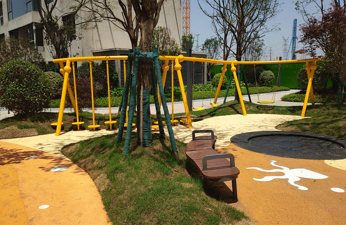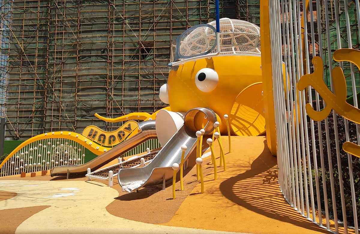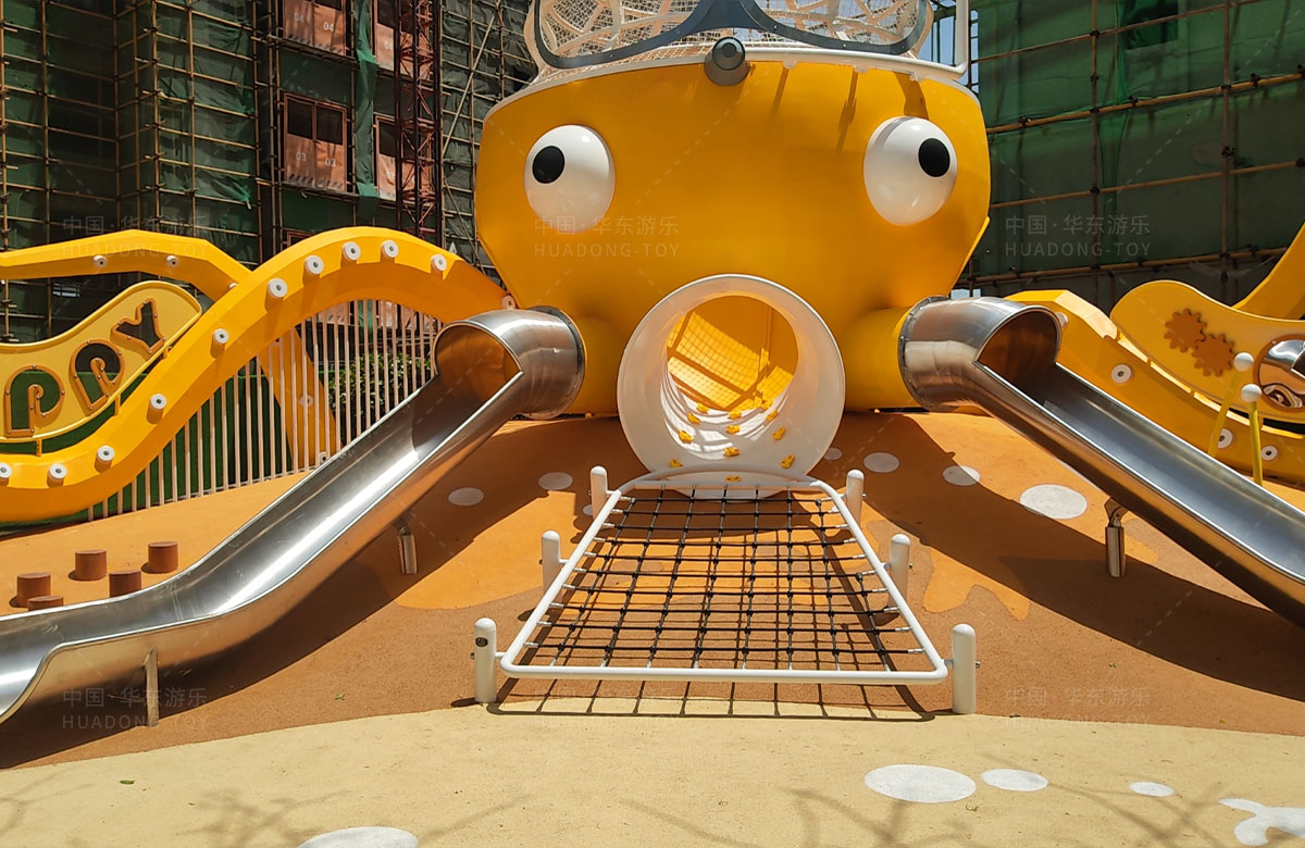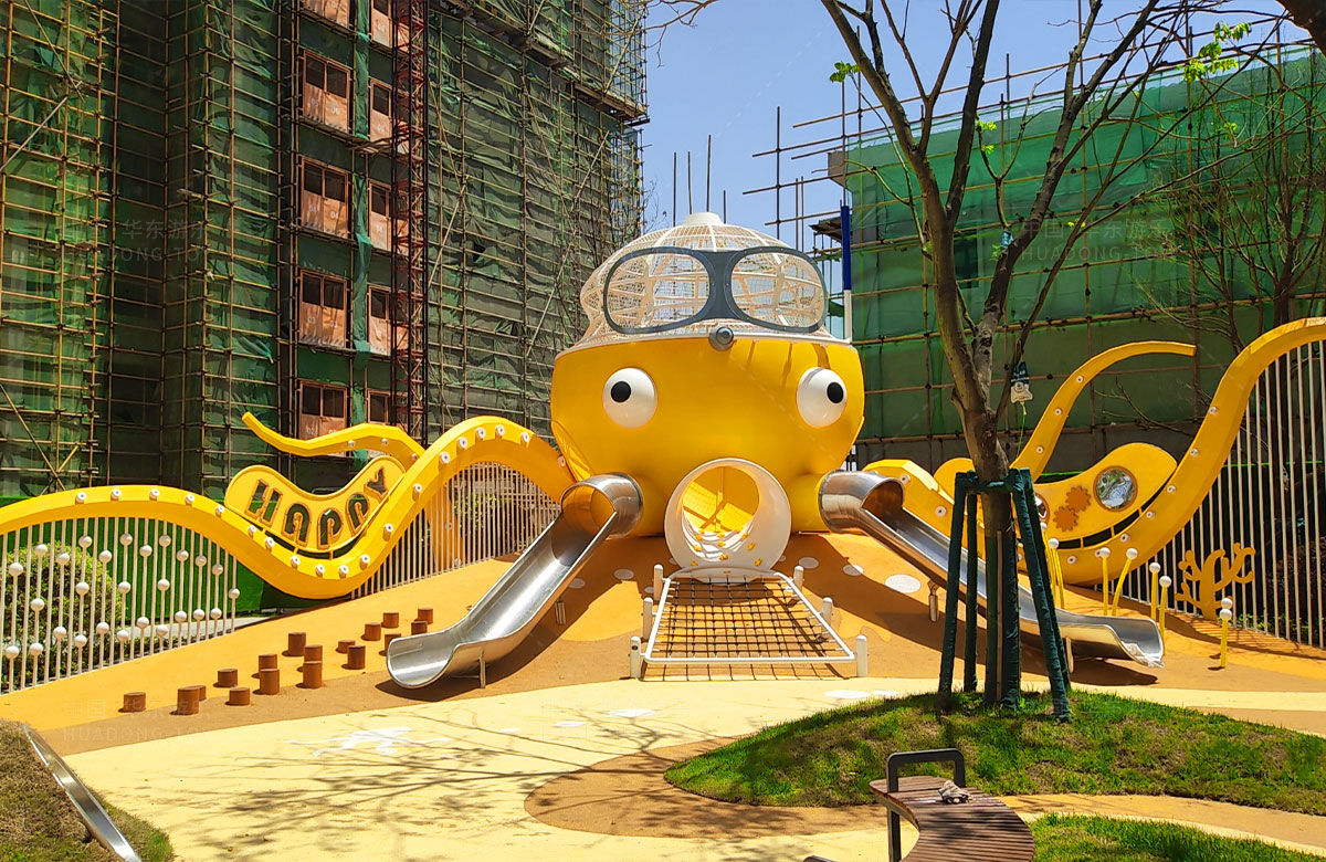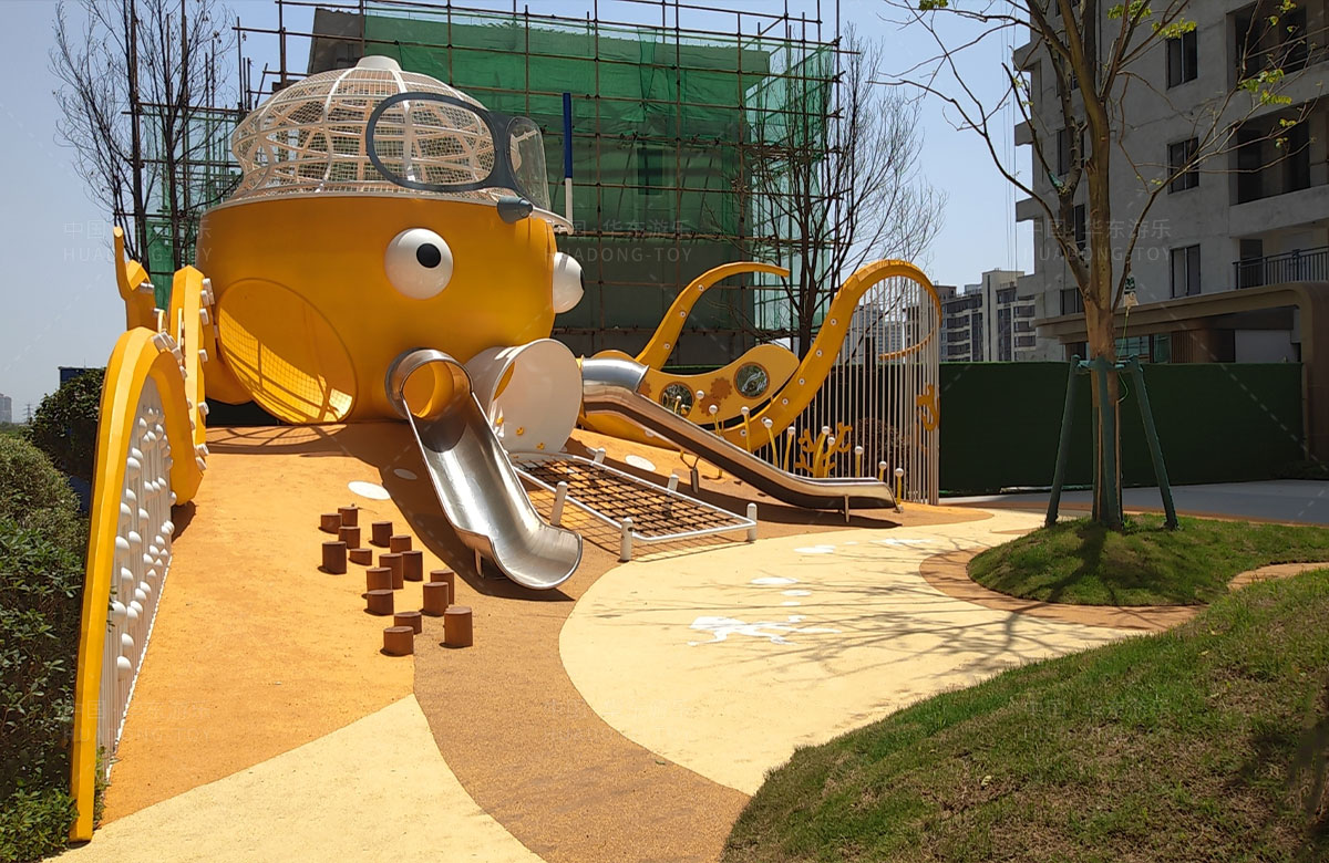 襄阳金辉优步学府此次选用的是金沙游乐自主研发和设计的以章鱼为主题的的游乐设备,该设备以生动的形象向小朋友展示了游乐设备的多姿多彩,结合各种的攀爬网、攀爬梯、不锈钢滑梯、攀爬杆、不锈钢钻洞、组合秋千,不仅仅丰富了小区的生活,同时也为生活在当地的人群提供了一个休闲、娱乐、遛娃的场所。