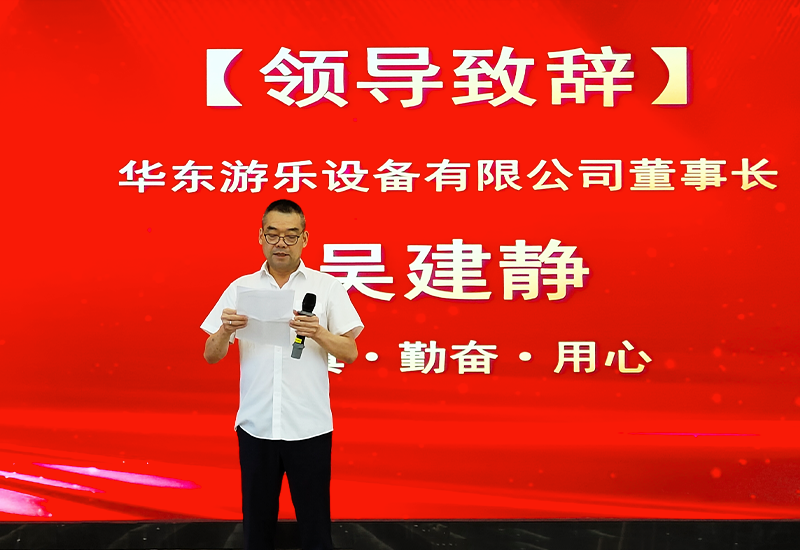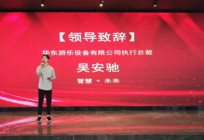 首先,在动员大会上,金沙游乐的执行总裁吴安驰分享了关于游乐设备与AI技术相互结合带来的智慧与未来。他相信,游乐设备与新技术的结合将会开启一个全新的游乐时代。
